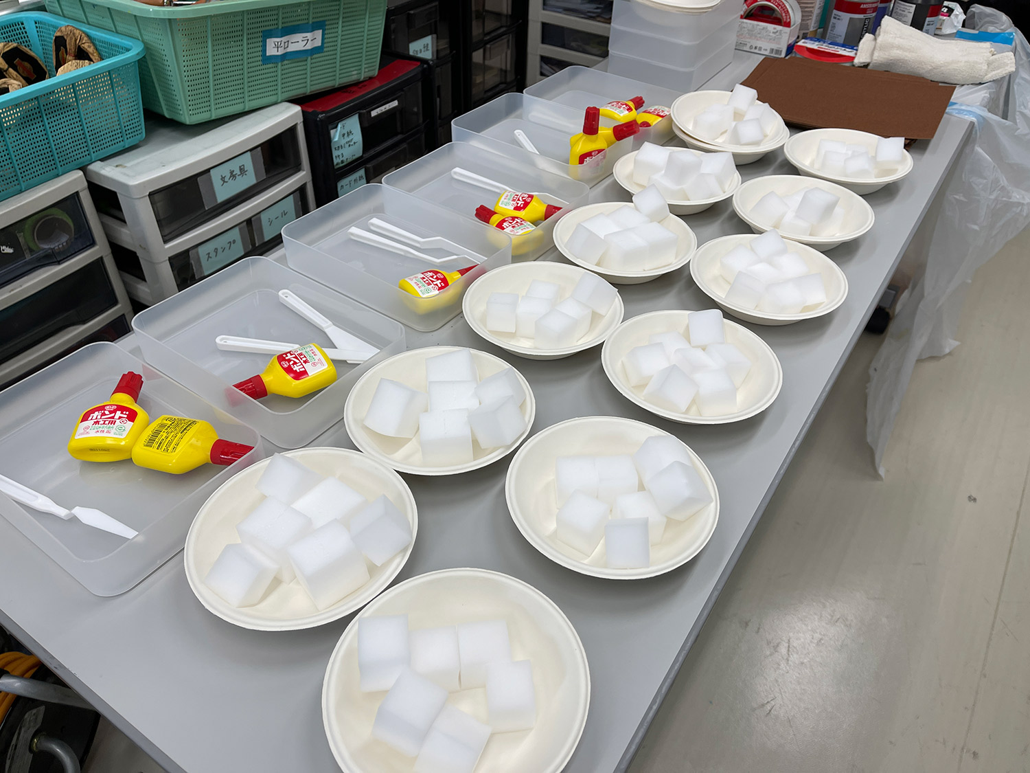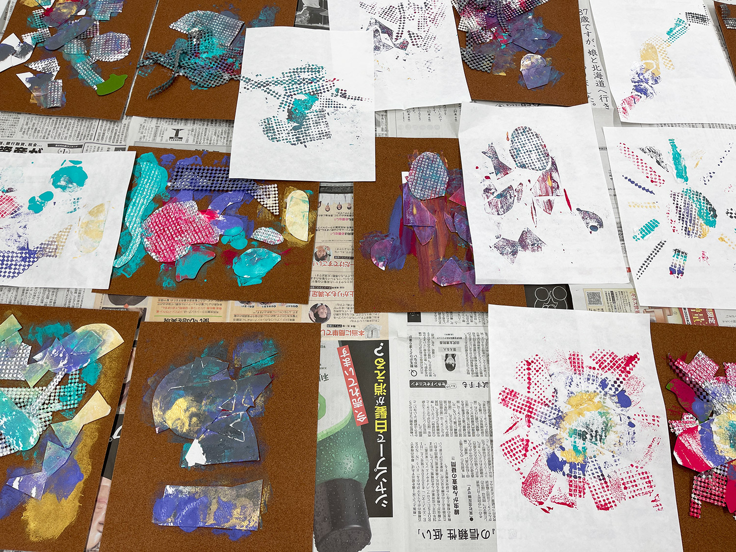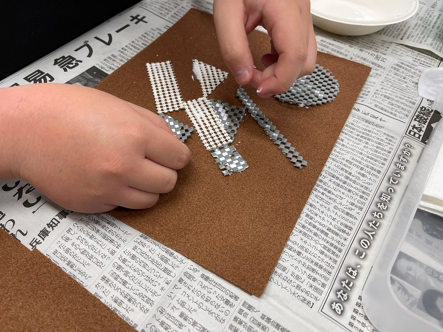 次に、目を開けるとテーブルの上には、ランダムにカットされた網やネット、厚紙、プラスチックなど、さまざまな素材の破片が広がっています。