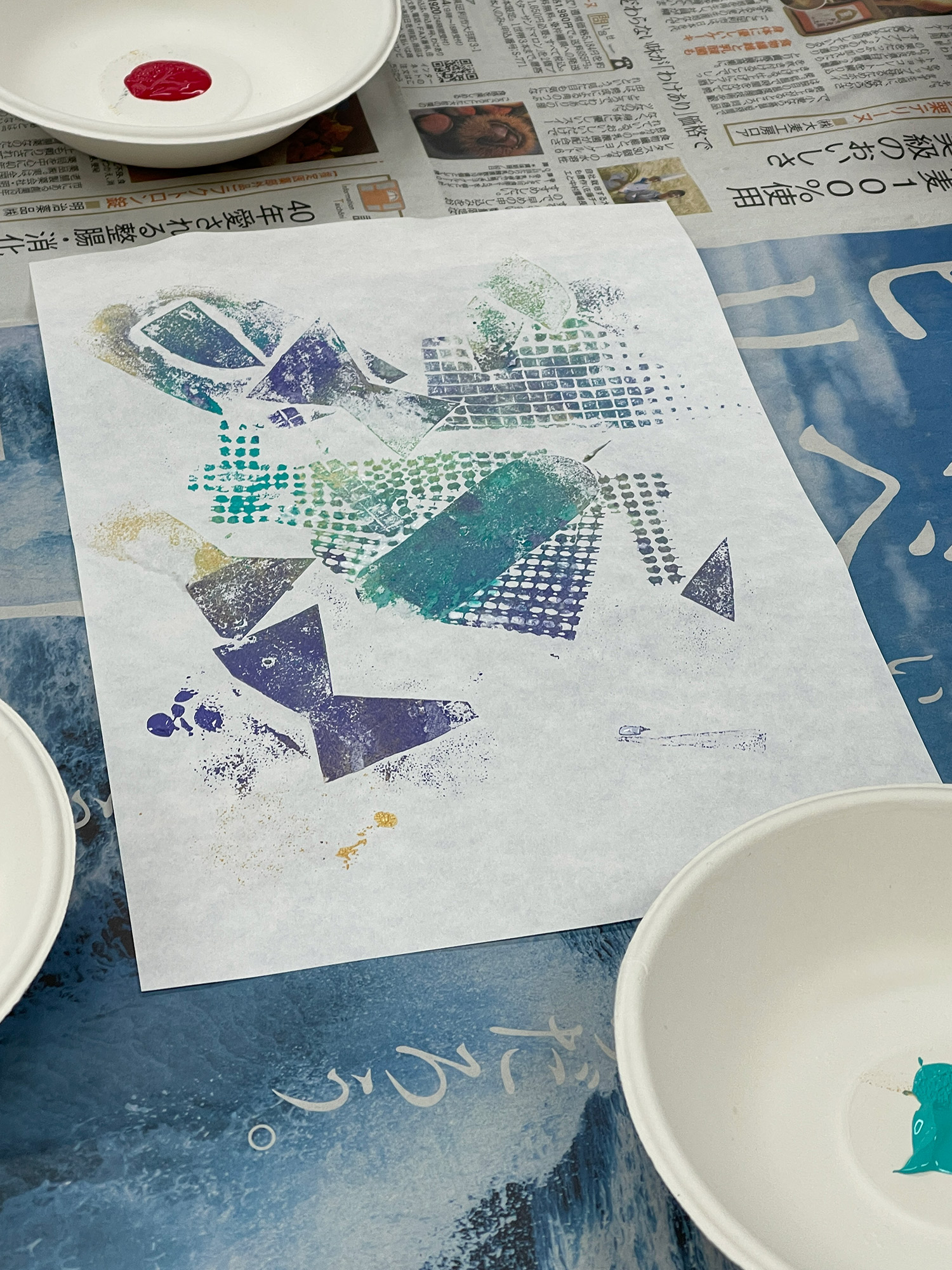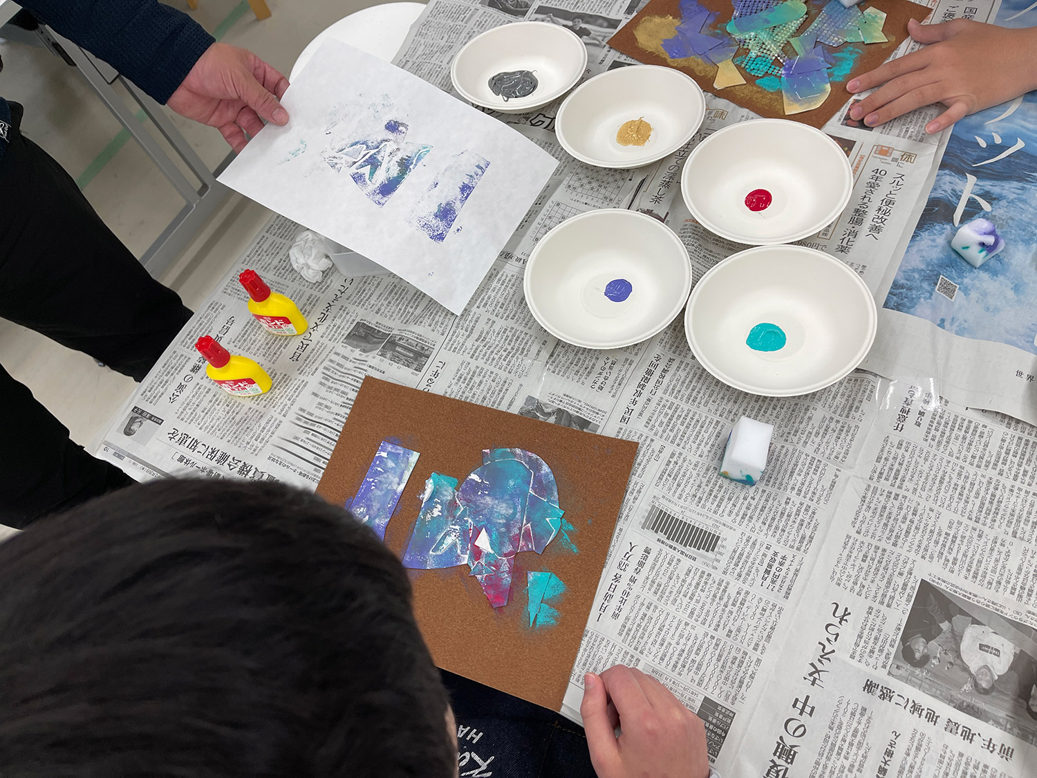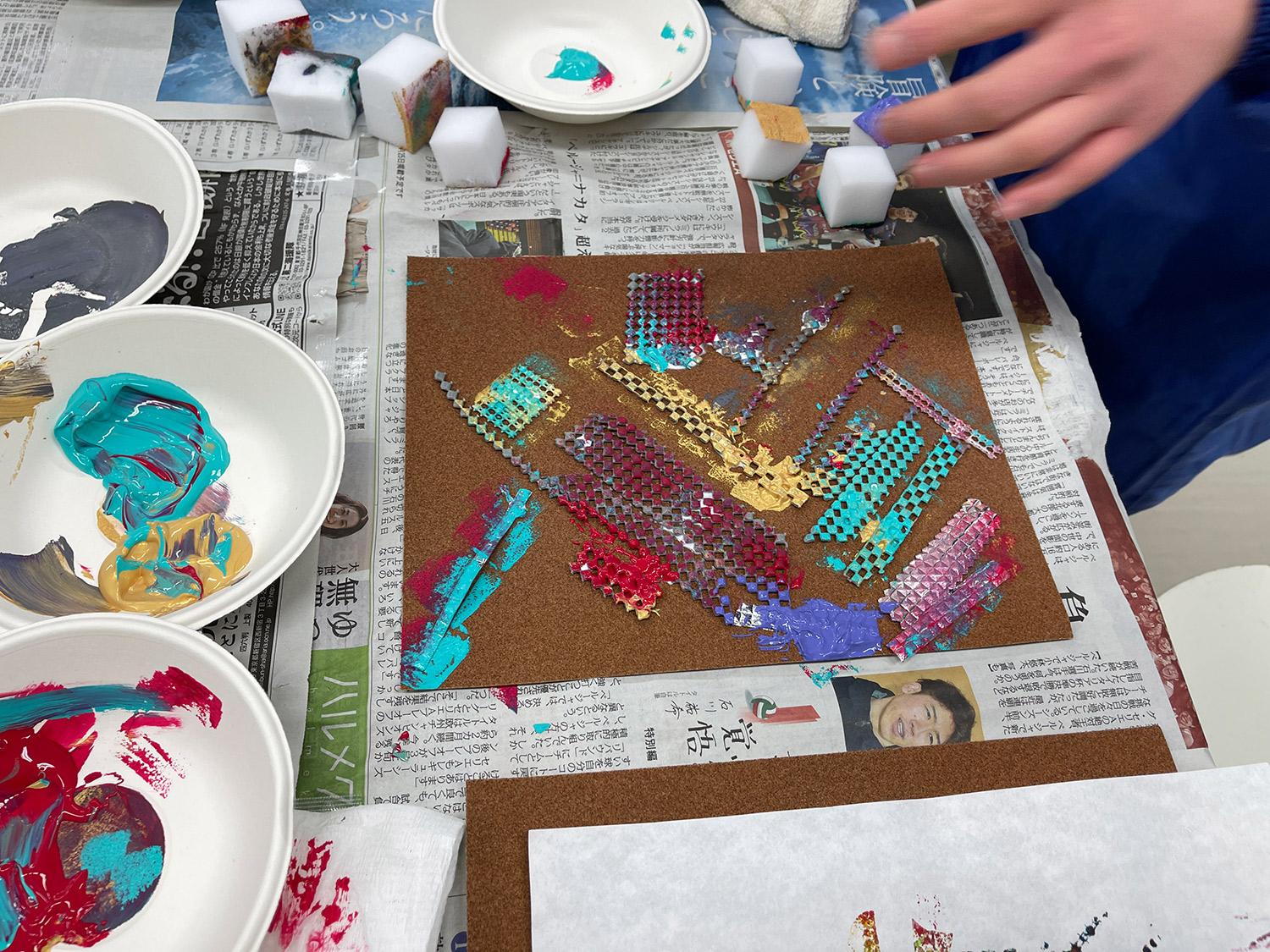 さらに、5色のアクリルガッシュをスポンジに含ませ、作った形の上から色をのせていきます。思い思いの色が重なり、音のイメージが次第に視覚的な世界へと変化していきました。