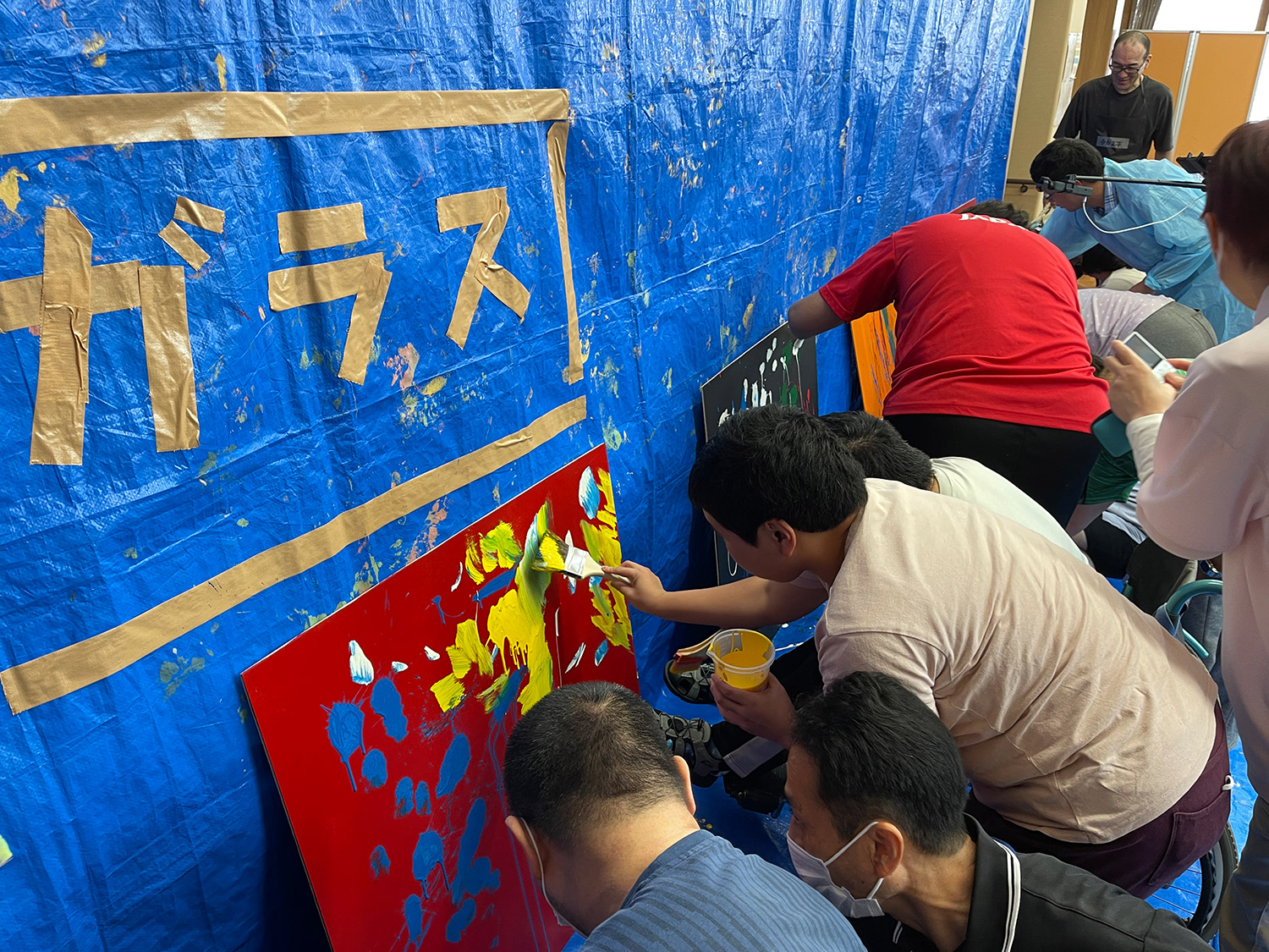 SMSのデザイナーのみなさんのリードのもと、「スタンプ」や「マスキング」ではリズミカルで躍動感あふれる表現が、「ドリッピング」ではライブを想起させる大胆で身体的なアートが生まれるなど、素晴らしい原画が次々と生まれました。