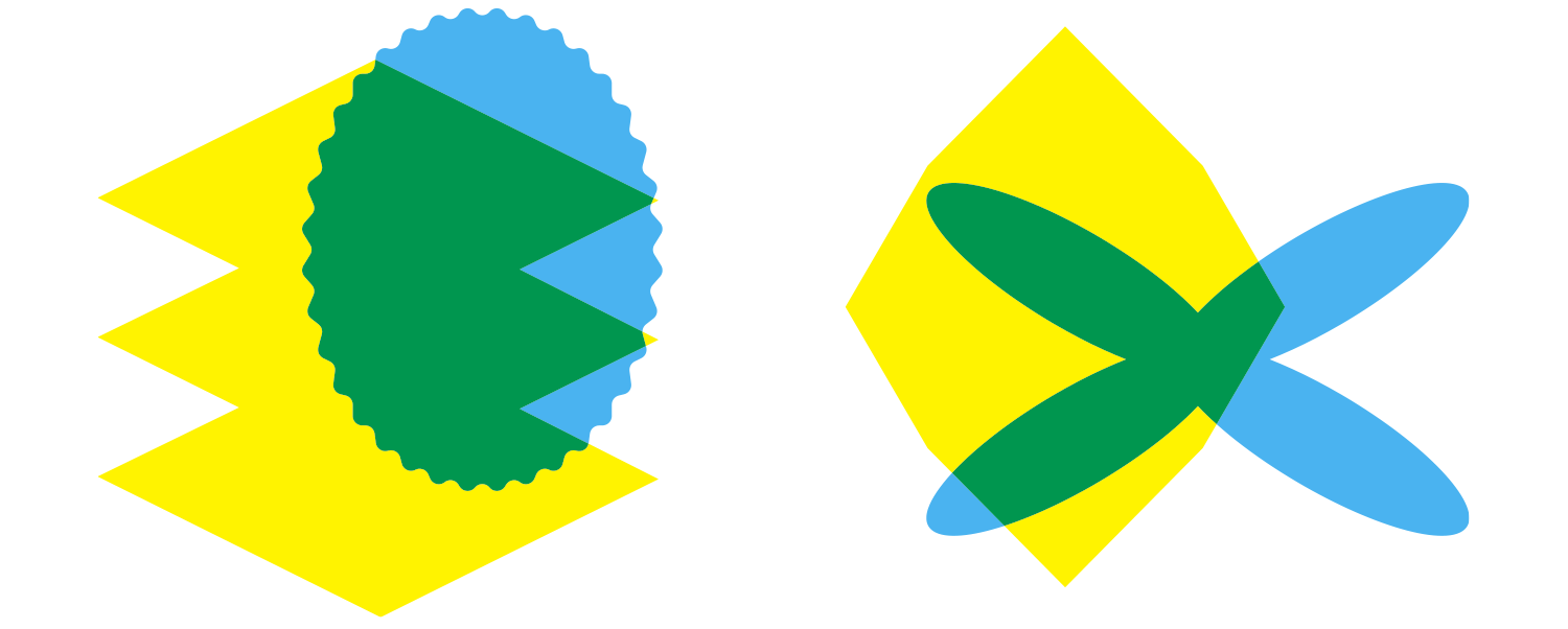 丸や四角といった、かたちの違うもの同士が重なり、その接点が鮮やかな「緑」に変わる。