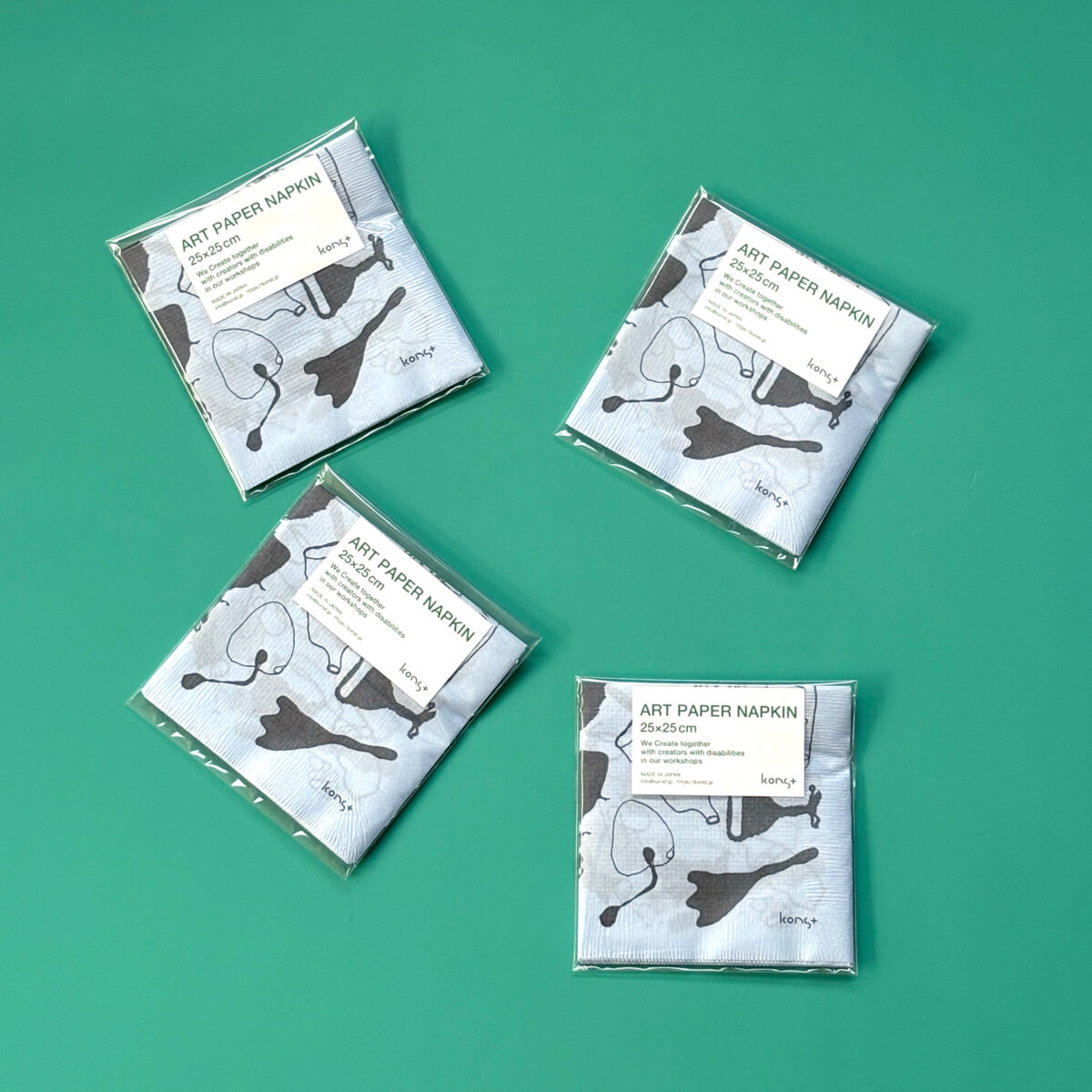 紐でテーブルウェアをつくる——そんなユニークなワークショップから生まれた原画が、ペーパーナプキンになりました。一筆書きのような自由な線と、どこかユーモラスなかたち。広げると、実際のテーブルウェアと、創作のテーブルウェアが、食卓の上で重なり合います。